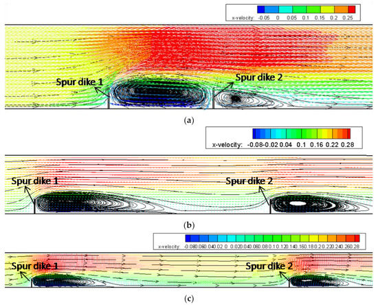 The velocity fields on the horizontal plane of Y = 0.08 m under different dike spacings. (a) s = 1.5 m (5b). (b) s = 4.8 m (16b). (c) s = 9 m (30b).
