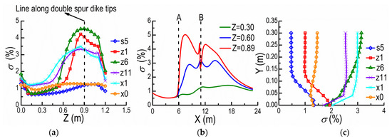 The spur dike turbulence intensity is estimated and shown in Figure 8. It belongs to medium intensity turbulence within 1–5% [33]. Figure 8a shows the distribution of the turbulence intensity along Z-direction, on the horizontal plane of Y = 0.08 m, at s5, z1, z6, z11, x1, and x0, where σ is defined as the ratio of the root-mean-square of the fluctuating velocity to the time-averaged velocity [33]. The turbulent intensities are very small at the upstream cross-section s5 and the downstream outlet x0, and are almost unchanged along the Z-direction. However, the turbulent intensities increase with their positions approaching the line along double spur dike (DSD) tips at the cross-sections between dikes (z1, z6, z11) and the downstream x1 of SD2. They all reach the maximum at the dike tips (Z = 0.9 m). The variation range of turbulent intensity at the cross-section z6 approaches the largest, and the maximal turbulent intensity approximately occurs here. Figure 8b reveals the variations of along X-direction, on the horizontal plane of Y = 0.08 m, at Z = 0.3, 0.6, 0.89 m. As shown in Figure 8b, the obviously cumulative phenomenon exists on the turbulent intensity curves in the line along DSD tips and its vicinity. The above results indicate that: (i) the spur dike tips present strong disturbance on the flow; (ii) the turbulent intensity reaches the maximum at the downstream of spur dike, then gradually restores; (iii) for the flow around spur dike, its fluctuating characteristics is more difficult to recover than its time-averaged velocity field; (iv) there is a cumulative effect of flow fluctuating between NDSDs. Figure 8c shows the changes of the turbulent intensity along Y-direction, on the central-axis plane of Z = 0.6 m at s5, z1, z6, z11, x1, and x0. There is a significant difference among the distributions of the turbulent intensity with water depth, at different cross-sections. The turbulent intensities at the cross-sections near SD1 (s5 and z1) are small and gradually increase downwards from the water surface. The turbulent intensities near SD2 (z11 and x1) and between DSDs (z6) are large and gradually decrease downwards from the water surface. The turbulent intensities at x0, however, are almost unchanged along Y-direction. These also illustrate the cumulative effect of flow fluctuating and the self-adjusting action of flow between DSDs.