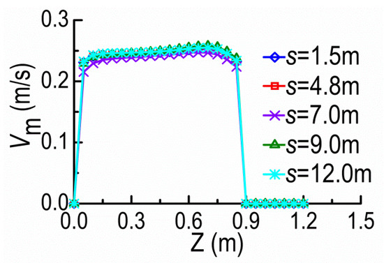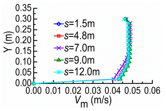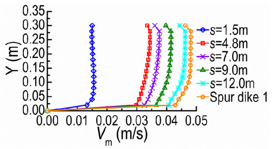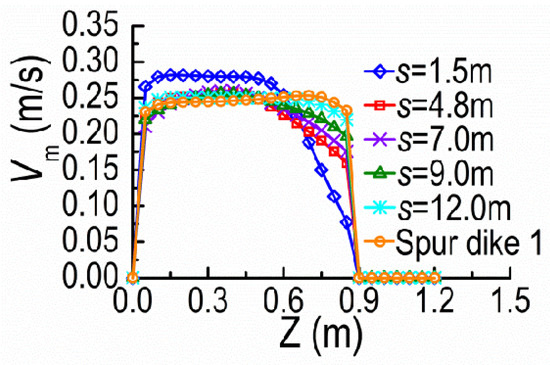 Figure 9 and Figure 10 show the velocity magnitude Vm distributions along the Z-direction at the cross-section A and the Y-direction at the tip vicinity of SD1, on the horizontal plane of Y = 0.08 m, under different dike spacings (s). The velocities at the cross-section A barely change for small s because SD2 remains in the shield area of SD1 where the mainstream is still constrained by SD1 and the mainstream is kept outside DSDs. With the spacing over the certain extent, the mainstream begins to diffuse and restore; meanwhile, SD2 acting on SD1 gradually fades with the former moving downstream.