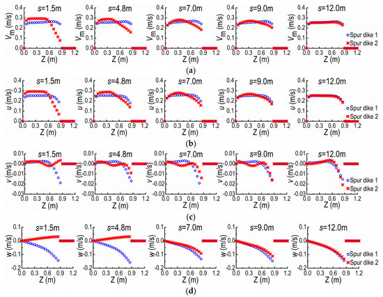 With moving SD2 away from SD1 under the same flow condition, Figure 13 shows the distributions of Vm, u, v and w at the cross-sections A and B at Y = 0.15 m for the s = 1.5 m (5b), 4.8 m (16b), 7.0 m (23.3b), 9.0 m (30b) and 12.0 m (40b). The distribution curves of velocity become more and more similar at the cross-sections A and B as increasing s. For s = 12 m, both curves are approximately the same, and this scale is close to the spacing threshold of NDSDs under the same flow condition. Furthermore, when the distributions of Vm are mostly coincident at the cross-sections A and B, the curves of u, v, and w at the same locations are also coincident, and the profiles of u and Vm are similar. Combining the previous results in Section 3.1, we can deduce that the similarity of u at the cross-sections of adjacent upper and lower spur dikes should be used as the criterion of the spacing threshold. In addition, we can estimate whether the velocity distributions at the cross-sections of adjacent two spur dikes are coincident or not according to the coincidence of velocities at their tips (Figure 13). To determine the spacing threshold conveniently, we can use the average velocity distributions along the water depth to replace the velocity distributions in these judgment criteria.