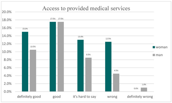 Referring to the question: “How do you rate the availability of services provided during the COVID-19 pandemic?”, a breakdown was made in the responses in terms of the number of women and men (Figure 1). Of men and women, 17.5% rated the availability of provided services during the pandemic well, 15% of women rated this availability strongly well, while only 10.5% of men gave this rating (“strongly well”). A bad rating was given by 12.5% of women and 4.5% of men. The answer “definitely bad” was indicated by 1% of men, and 0% of women. In contrast, 13% of women and 8.5% of men had no opinion. There was no relationship between the variable’s gender and the evaluation of the availability of medical services during the COVID-19 pandemic (p > 0.05).