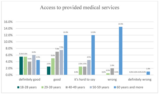 For the same question—How do you rate the availability of services provided during the COVID-19 pandemic?” for respondents by age (Figure 2), in the age group of 60 and over, 14.5% of respondents rated the availability of services provided during the pandemic poorly. The answer good was marked by 4.5% of people, and bad by 1% of respondents. The same number, i.e., 12% of respondents, marked the answer “good” and “hard to say”. In the 50–59 age group, the largest number of respondents answered “good” (7.5% of people). Six percent of respondents marked the answer “definitely good”, and “hard to say” was indicated by 4.5%. No one marked the answers “bad” and “definitely bad”. On the other hand, in the 40–49 age group, the highest number of responses was “good” (7%). “Good” was marked by 4% of respondents, 2.5% of people had no opinion on the subject, and 2% of respondents indicated the answer “bad”. No one marked the answer “definitely bad”. Respondents in the 29–39 age group mostly indicated the answer “definitely good” (5.5%), 5% of people indicated the answer “good”, 0.5% indicated the answer “bad”, and 2.5% had no opinion. Additionally, no one marked the answer “definitely bad”. In contrast, in the 18–28 age group, there are only two ratings, i.e., “definitely good” (5.5%) and “good” (2.5%). A statistically significant relationship was found between the variable age and the evaluation of the availability of services during the pandemic. Those over 60 were more likely to negatively evaluate the availability of medical services provided during the COVID-19 pandemic (T = 11.868; r = 0.632; p = 0.001).