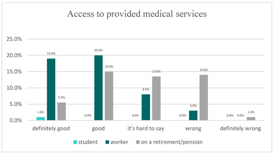 About the professional status of the respondents, the answers to the above question—“How would you rate the availability of services provided during the COVID-19 pandemic?” (Figure 3)—were as follows: among working people, as many as 20% of respondents rated the availability of provided services during the pandemic well, 19% of working respondents indicated the answer “definitely well”, 3% “poorly”, while 8% had no opinion. No one marked the answer “definitely bad”. Those on a pension, on the other hand, mostly (15%) marked the answer “good”. Of respondents, 14% marked the answer “bad”, while 13.5% had no opinion on the subject. In contrast, “definitely good” was marked by 5.5% of people, and “definitely bad” by 1%. Those who were pupils or students (1%) marked one answer—”definitely good”. There was a statistically significant relationship between the variable of occupational status and the assessment of the availability of services during the pandemic. Those who were employed/retired were more likely to negatively evaluate the availability of medical services provided during the COVID-19 pandemic (T = 12.003; r = 0.614; p = 0.002).