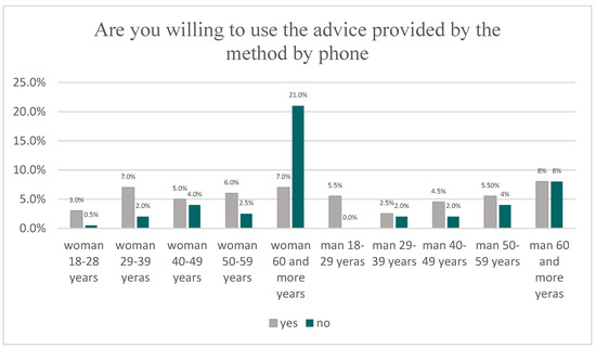 Another question asked “Are you willing to use telephonic advice?”, and respondents were grouped by age and gender (Figure 4). Overwhelmingly, reluctance to teleprompting was shown by women in the age group of 60 years and older (T = 10.099; r = 0.703; p = 0.001). The rest of the respondents’ answers were similar, so no differences were noted (p > 0.05). The more frequent response was “yes” among both women and men, regardless of age.