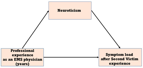 Within this sample, participants’ age and sex did not prove to be predictors of a high symptom load. After the inclusion of professional experience in the regression model, the results showed that professional experience as an EMS physician was associated with SV status, i.e., the less experience, the higher the symptom load (unstandardized regression coefficient B = −1.97; p < 0.05; BCa 95% CI [−3.60, −0.42], see Table 3). We could not perform multiple regression with workplace in acute care (yes vs. no) since this variable was constant after listwise exclusion of missing values. After we added the five personality scales in the regression equation, the impact of professional experience as an EMS physician on symptom load was no longer significant. Thus, the only significant predictor was neuroticism in the final model (B = 0.91, BCa 95% CI [0.35, 1.48], see Table 4). Since professional experience decreased its magnitude of effect size after neuroticism had been added in the model, we assumed that neuroticism might have acted as a mediator variable in the relationship between professional experience and symptom load, i.e., the influence of professional experience on symptom load may take an indirect path through neuroticism as a mediator variable. Consequentially, we tested the indirect effect of experience as an EMS physician via neuroticism on symptom load (see Figure 1) using SPSS PROCESS macro, model 4 [17]. The model applies the bootstrapping method per default with the deviation correction at 95% confidence interval based on 5000 samples to estimate direct, indirect and total effects.