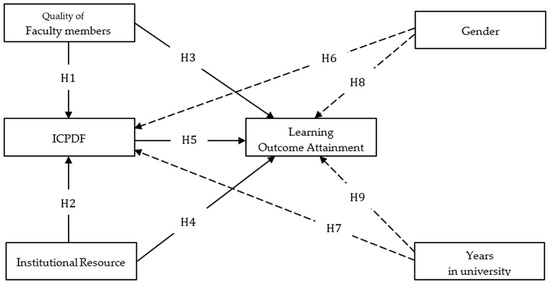 This study involves four constructs: the quality of faculty members, institutional resources, ICPDF, and learning outcome attainment. Demographic information, age, and years at university were also included to understand the differences that emerge on the ICPDF and learning outcome attainment (Figure 1). Previous studies have assessed the quality of the faculty members towards education, training, and research achievement [11]. Quality of faculty members improving teaching quality might foster the level of motivation and the students’ critical thinking [12,13,14,15]. In this study, we investigated whether the quality of faculty members affects the ICPDF and learning outcome attainment. It is important to understand the role of faculty members in bringing the success of curriculum implementation and improving learning outcome attainment.