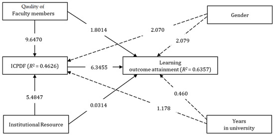 Adding the significance test results, effect sizes (f2), coefficient determination (R2), and predictive relevance (Q2) were computed to support the structural model. Effect sizes inform the effect of predictors on dependent variables, symbolized by f2. The value of 0.02 was a small effect, 0.15 a medium effect, and 0.35 a large effect [26]. Table 5 informs that the strongest f2 was on the relationship between the quality of faculty members and ICPDF (f2 = 0.3400), while the smallest f2 emerged between institutional resources and learning outcome attainment (f2 = 0.0000). The coefficient of determination (R2) was also computed. R2 is used to measure predictive accuracy: it is the square correlation between a certain endogenous construct. R2 values should range from 0 to 1. A higher value shows a higher R2: 0.75 (substantial), 0.50 (moderate), and 0.25 (weak) [27]. Figure 2 exhibits the result of R2: ICPDF (R2 = 0.4626, moderate) and learning outcome (R2 = 0.6357, substantial). In conclusion, the data of this study appeared to be appropriate for the R2. The study utilized Stone–Geisser’s Q2 values to report the results of predictive relevance. Q2 is a computational method used in PLS-SEM to evaluate predictive accuracy [27,28]. When the model displays predictive relevance, it can precisely predict the data points of indicators in the model. SmartPLS was used to execute the process of blindfolding. A Q2 value greater than 0 indicates that the construct has been accomplished. The Q2 values for ICPDF (0.3797) and learning outcome attainment (0.2729) were above 0, indicating that the model’s predictive relevance was good.