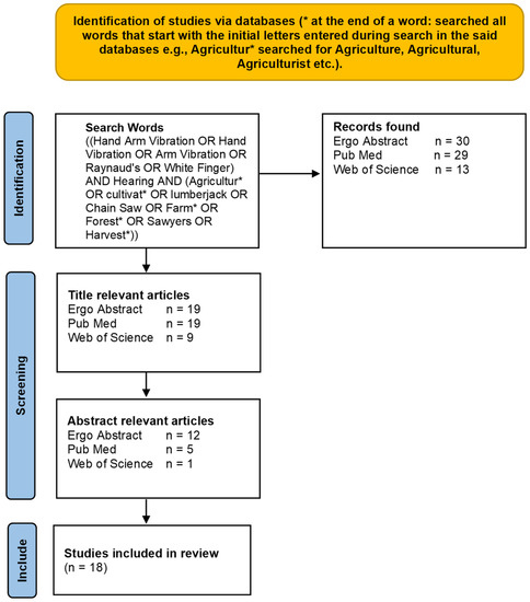 First, a systematic literature review protocol was developed. The search was carried out in three different databases (a) Web of Science, (b) PubMed, and (c) Ergo abstracts. Different combinations of words were chosen using ‘AND’ and ‘OR’ operators to identify articles relevant to the study. Finally, a string of words that resulted in the maximum number of relevant articles in searched databases for the purpose of the study was: ((Hand Arm Vibration OR Hand Vibration OR Arm Vibration OR Raynaud’s OR White Finger) AND Hearing AND (Agricultur* OR cultivat* OR lumberjack OR Chain Saw OR Farm* OR Forest* OR Sawyers OR Harvest*)).