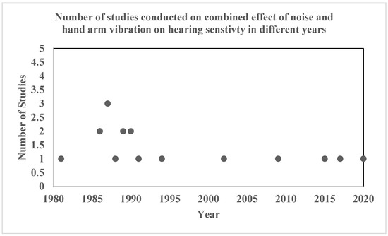 Figure 2 represents the number of studies published on the combined effect of noise and hand-arm vibration on hearing sensitivity at different points in time. The figure represents that 1987 had the highest number of studies conducted (three studies), followed by two studies in 1986, 1989, and 1990, and finally, one study in each of the other years. It can be said that very few researchers have studied the relationship/impact of the combined exposure of noise + hand-arm vibration on hearing sensitivity.
