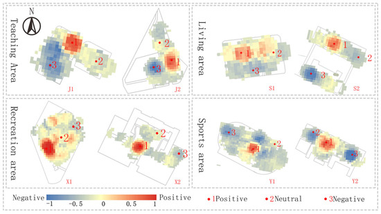 - Indicators of campus spatial features are related to public space type, and indicators of the same features often vary greatly across different spatial types. This is a side indication of how much students like different public spaces. The combination of the emotion map constructed in this study demonstrates that emotions in the leisure and sports space tend to be positive. In contrast, emotions in the teaching and living space tend to be more negative.