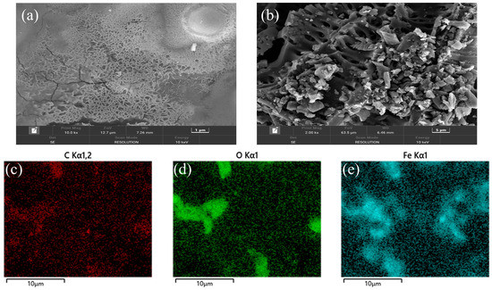 The effect of biochar on DIET is mainly reflected in the electron transport capacity, the stronger the electron transport capacity, the higher the efficiency of biochar-mediated DIET. In the SEM images of MBC and C-BC (Figure 1a,b), the microporous structure of MBC was more intensive than that of C-BC and provided a conducive environment for microbial attachment. The EDS analysis (Figure 1c–e) showed that the surface of MBC contained C, O, and Fe. In addition, as with the magnetized leaf biochar studied by Huang et al. [29], MBC had a smaller surface area and pore volume than C-BC, probably due to the iron oxide crystals formed by magnetization that blocked the original pores of C-BC.