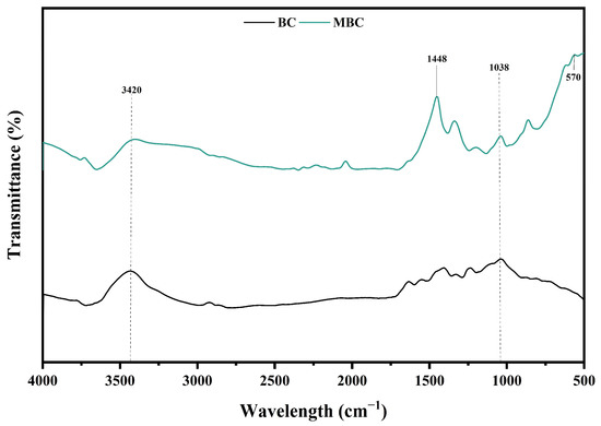 The FTIR spectra showed the changes of biochar functional groups before and after magnetization (Figure 2). Both C-BC and MBC had obvious absorption peaks for O-H stretching vibration at 3420 cm−1, which was conducive to the occurrence of ion exchange [30]. The peak at approximately 1448 cm−1 was assigned to C=C stretching vibration of the aromatic structure and only appeared in MBC, indicating that MBC has high aromaticity and stability, and the aromatic structure can be used as an electron donor [31]. The peak at 1038 cm−1 belonged to C-O bond of the ether, and MBC peak intensity increased compared to C-BC, indicating an increase in oxygen-containing functional groups [32]. The FTIR spectra of MBC showed a new peak at 570 cm−1, corresponding to the Fe-O characteristic peak, which indicated that FeCl3 was successfully loaded on biochar [33].