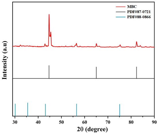 Figure 3 showed the XRD pattern of MBC, which confirmed the main chemical composition of the material. The major crystalline phases of MBC were magnetite and Fe, further confirming the successful magnetization of biochar. The diffraction peaks of magnetite were 2θ = 30.12°, 35.48°, 43.12°, 57.03°, and 71.04°, which was consistent with the standard card of magnetite (PDF#88-0866). Simultaneously, three new characteristic peaks at 2θ = 44.64°, 65.07°, and 82.34° were observed, which corresponded to the standard card of Fe (PDF#87-0721). MBC may have high electron conductivity due to the contents of magnetite and Fe.