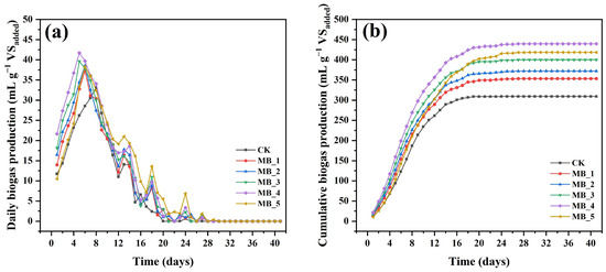 In order to investigate the effect of MBC on the biogas production process of mesophilic AD, five different doses of MBC were added to the anaerobic system and compared with the control reactor without addition. Daily biogas production with MBC addition was within the range of 0–41.71 mL g−1 VSadded (Figure 4a). From the fifth day, the biogas production of the MBC reactors gradually reached the peak, and peak daily biogas production was followed the order of MB_4 (41.71 mL g−1 VSadded) > MB_3 (39.64 mL g−1 VSadded) > MB_2 (38.57 mL g−1 VSadded) > MB_5 (38.30 mL g−1 VSadded) > MB_1 (37.26 mL g−1 VSadded). At about the eighth day, the control reactor slowly reached the peak daily biogas production (33.17 mL g−1 VSadded), which was lower than all reactors with MBC addition. The results confirmed that MBC resulted in earlier peaks of daily biogas production.