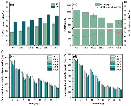 Effect of MBC on AD performance for 41 days. TS/VS removal efficiency (a). sCOD content and removal efficiency (b). Changes of soluble polysaccharide (c) and soluble protein (d).