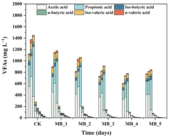 Variation in the VFAs during AD is shown in Figure 6. During the process of hydrolysis and acidification, soluble organic matter was decomposed into VFAs, which were further converted into methane [47]. VFAs mainly include acetic acid, propionic acid, butyric acid, and valeric acid. From Figure 6, the VEA concentrations of six reactors first increased and then decreased. The peak values of VFA concentrations appeared around the fifth day. The VFA concentrations decreased sharply from days 5 to 11, and then remained at lower concentrations. In each group, acetic acid and propionic acid were the main metabolites. All groups with MBC showed lower acetic acid concentrations than the CK group because the addition of magnetic carbon-based materials increased the electron shuttling efficiency [48].