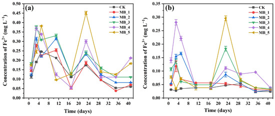 Iron mainly exists in the form of soluble Fe3+ and Fe2+ in the AD process of sewage sludge. Figure 7 shows the concentration variations of Fe2+ and Fe3+ in the six reactors. FeCl3 was a flocculant commonly used in wastewater treatment plants, thus the control reactor also had a small number of iron ions, and a concentration of soluble Fe3+ with a small change (0.024–0.053 mg/L). In the early stage of AD, the concentration of Fe3+ increased rapidly, due to the Fe3+ loaded on the MBC being released. During the hydrogen production and acid production phases, the concentration of Fe3+ decreased rapidly. The large amounts of reduced state hydrogen were produced to reduce Fe3+ to Fe2+ and provided electrons to the digestive system. It was also enriched with iron-reducing bacteria, which can promote the reduction of dissimilatory iron [53]. In addition, the presence of MBC ensured a continuous supply of iron ions during the AD process. On the 23rd day, the concentration of Fe3+ increased rapidly again, which corresponded to a simultaneous increase in biogas production.