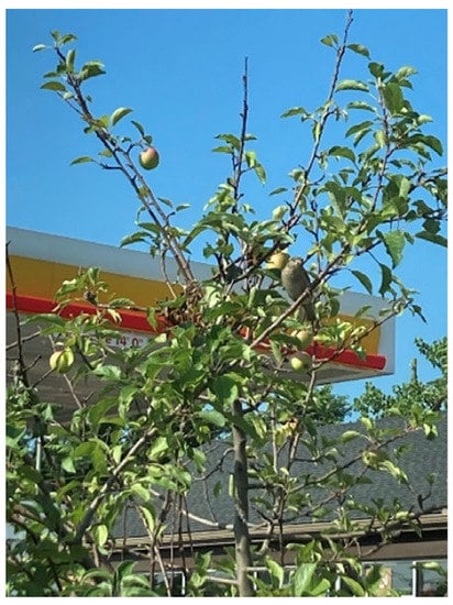 In their photos, youth depicted the juxtaposition of natural and man-made elements. For example, in one photo (Figure 1), a bird is seen in a fruit tree next to a gas station, alleviating the stress of a tense car ride. In another (Figure 2), power lines can be seen in an otherwise undeveloped landscape. In both cases, adolescents found unexpected surprises. Some excerpts from youth’s summary statements highlight this concept: