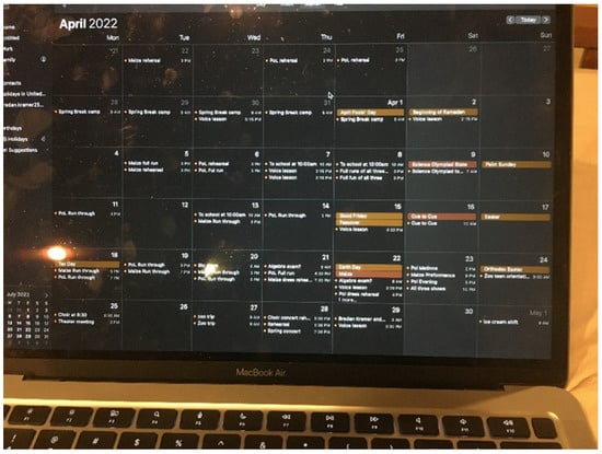 Participants provided examples of barriers they experience to finding time for nature. Participating youth shared photographs within this theme depicting a teacher in a classroom without windows (Figure 8), a highway view from a car windwo (Figure 9), and a screenshot of one participant’s calendar (Figure 10). These photographs represented the lack of nature where youth spent time (namely in school and in driving long distances between home, school, and activities) and the lack of available time to seek nature.