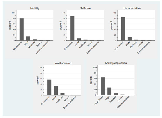 The median EQ-VAS score and the utility index of the EQ-5D-5L were 73.0 (IQR, 59.0, 84.0) and 0.942 (IQR, 0.876, 1.000), respectively. Regarding the EQ-5D-5L, the majority of patients reported no problems in mobility (80.0%), self-care (88.0%), usual activities (84.1%), pain/discomfort (56.6%), or anxiety/depression (64.1%) (Figure 1).
