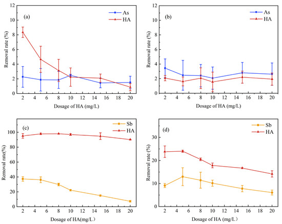 Effect of HA concentration on the removal of As and Sb ((a) K2FeO4(Fe of 2.26 mg/L) +HA + As, pH = 6.5; (b) HA + As, pH = 6.5; (c) K2FeO4 (Fe of 3.39 mg/L) + HA + Sb, pH = 4.5; (d) HA + Sb, pH = 4.5).