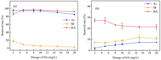 Effect of HA dosing on the simultaneous removal of As and Sb. (a) K2FeO4 (Fe of 8.48 mg/L) treatment; (b) no K2FeO4.
