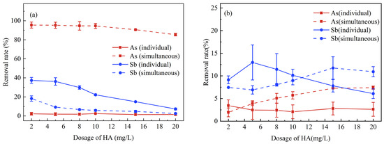 Comparison of HA dosing on the removal of As(III) and Sb(III) between individual and simultaneous treatments ((a) K2FeO4 treatment; (b) no K2FeO4).