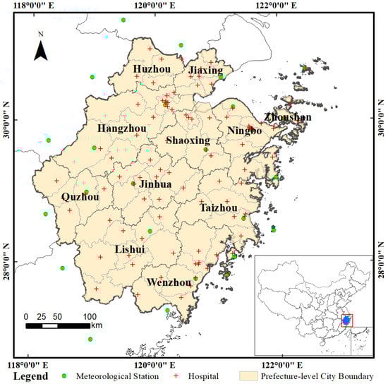 Geographical location of the study area showing the distribution of meteorological stations and hospitals.