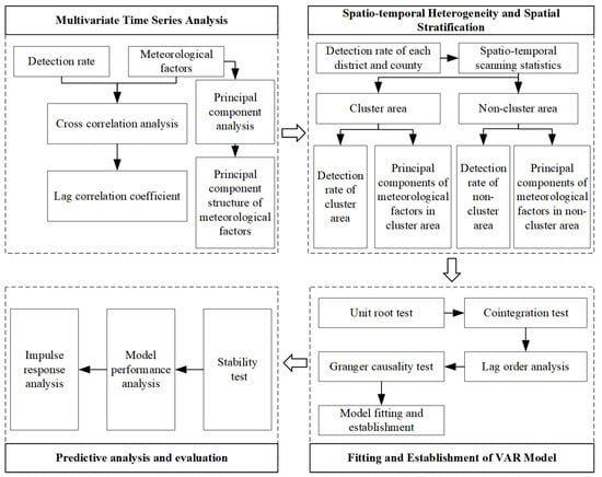 The vector autoregressive model is suitable for multivariable time series systems to analyze the dynamic impact of random disturbances on variable systems and explain the effects of various shocks on variables []. The model can determine the dynamic relationship between climatic variables and the detection rate of bacterial foodborne diseases in a time series; it does not need to distinguish between exogenous and endogenous variables or add constraints to the model. The basic principle is to consider each endogenous variable in the system as a function of the lag value of all other endogenous variables in the system and construct a model. The mathematical expression of the VAR model (p) is