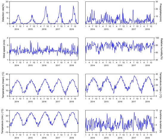 Summary of the weekly detection rate of V. parahaemolyticus and weather conditions of Zhejiang province, 2014–2018.