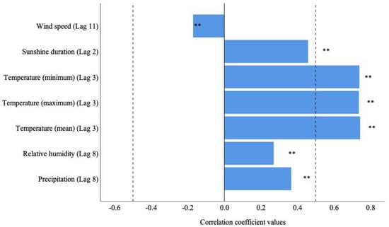 Correlations between seven climatic factors and the weekly detection rate of V. parahaemolyticus in Zhejiang Province from 2014 to 2018. Lag number: number of weeks prior; ** p < 0.01.