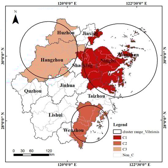 Three significant spatio-temporal aggregation areas were detected using spatio-temporal scanning statistics (Table 3). Vibriosis had an evident clustering tendency in time and space. The period from the 28th to the 37th week of 2016 (June–August 2016) had the highest incidence of vibriosis. The detection rate of V. parahaemolyticus in the eastern coastal areas and northwest Zhejiang Province was significantly higher than that in the southwest area from a spatial perspective (Figure 5).