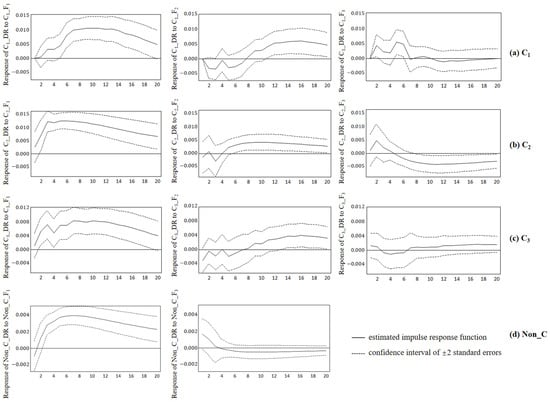 Responses of the detection rate to a meteorological component shock in (a) the C1 cluster, (b) C2 cluster, (c) C3 cluster, and (d) Non_C region at given horizon h (h = 1, 2, … 20) with a confidence band. Notes: The forecast horizon [weeks] is given on the horizontal axis. The vertical axis shows the magnitude of the impulse response, and a negative value represents the reduction effect. Dashed lines represent a confidence interval of ±2 standard errors.