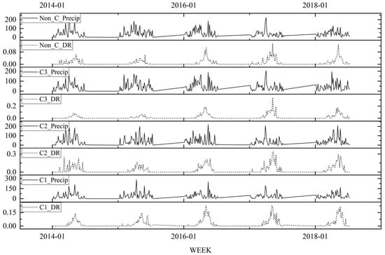 The positive response to wind-related principal component shock showed that wind speed can affect the reproduction of V. parahaemolyticus, viability, and time in the environment. Weather conditions with high wind speeds may be conducive to the spread of bacterial pollutants and may indirectly affect the occurrence of Vibriosis; this is consistent with previous findings []. The impulse response of detection rate of V. parahaemolyticus to the moisture-related principal components was not obvious in the initial stage. The growth trend of the impulse response curve showed that the moisture meteorological parameters had a lagging effect on vibriosis after being influenced for a period of 7 weeks. Precipitation in the time series diagram showed an obvious lag effect, and the lag response in different regions was different (Figure 7). For example, the detection peak of V. parahaemolyticus in Zhejiang Province corresponded to the detection peak of V. parahaemolyticus after 3–7 weeks. This was consistent with the impulse response of the moisture meteorological parameters in this model. However, it differs from previous studies. For example, there is a significant positive correlation between vibriosis and relative humidity in Korea []. Meanwhile, changes in the meteorological conditions (such as humidity) may change the characteristics of survival and transmission patterns of microorganisms such as V. parahaemolyticus, increasing the number of cases of vibriosis []. This difference may be due to those studies failing to consider the combined effects of meteorological factors and spatial heterogeneity. These results indicated spatial differences in the effects of meteorological factors on the detection rate of bacterial foodborne diseases. This reflected the effectiveness of the innovative idea of dividing the study area with spatio-temporal scanning statistics to explore the dynamic relationship between detection rates and meteorological factors.
