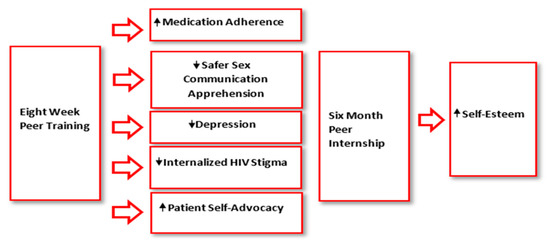 Self-esteem was significantly increased in the training-only group. While the peer internship group did not have a significant increase in self-esteem between baseline and training completion, this group did have a significant increase between baseline and internship completion. Escovitz and Donegan evaluated a vocational development program for PLHIV and found that program participation boosted participant’s satisfaction with life [51]. Hergenrather et al. found that participants in work readiness programs for PLHIV had significantly higher self-esteem post-intervention, whereas changes in depression were insignificant [47]. Rosenberg’s model charged that changes in specific self-esteem impact global self-esteem [64,77]. The program’s conceptual model assumed a person’s global self-esteem would be mediated through specific types of self-esteem (i.e., patient self-advocacy, safer sex communication, and medication adherence) during the training period and six-months of hands-on peer work experience. Silván-Ferrero found that a longer length of employment strengthens the relationship between perceived discrimination and self-esteem mediated by internalized stigma among people with mental illness [78]. Further mediation analysis related to self-esteem and internalized stigma with a larger sample size are needed to confirm this theory among peer workers.