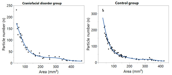 Masticatory efficiency curves comparing patients with craniofacial disorders (n = 42) and the healthy control group (n = 77). The obtained chewed particle number (n) is plotted against the obtained surface area (mm2).