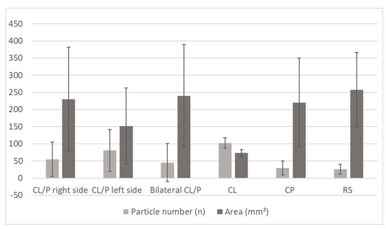 Additionally, the effect of the chewing side (left/right/bilateral) for each of the cleft formations was analyzed. No significant differences among the different formations could found be for the left and bilateral chewing sides, whereas statistically significant differences were recorded for the right chewing side. A significant difference between left CL/P and RS patients was found for the right chewing side, regarding both number of particles (nCL/P_left = 27.06 ± 4.09 vs. nRS = 6.75 ± 8.67; p = 0.04) and area (ACL/P_left = 150.39 ± 108.72 mm2 vs. ARS = 329.19 ± 117.42 mm2; p = 0.01). Within the right chewing side too, differences in particle number were observed between left CL/P and CP (nCP = 7.5 ± 8.67), whereas differences in area were found between left and bilateral CL/P (ACL/P_bilateral = 292,65 ± 184 mm2, p = 0.02), as well as RS and CL (ACL = 92.59 ± 15.78 mm2, p = 0.03).