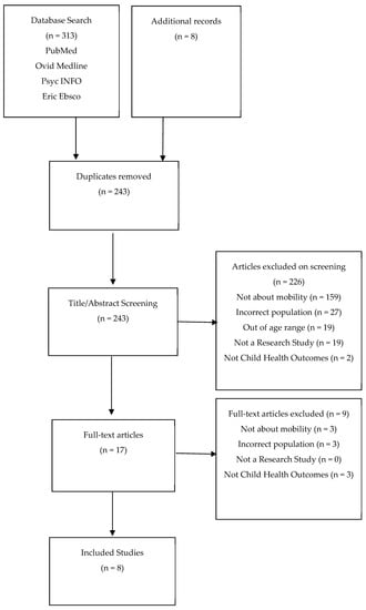 The systematic search identified 321 articles, 8 of which were identified through reference screening. Of these, 78 were duplicates, leaving 243 articles to screen the title and abstracts. The major reasons for excluding papers were: data on mobility not reported; findings for Indigenous children from Australia, Canada, and New Zealand not reported; not examining child health outcomes by mobility. After a full-text review, eight articles were deemed to fit the inclusion criteria (see Figure 1). PROSPERO Registration: CRD42022311367. Results from quantitative and qualitative studies have been reported separately.