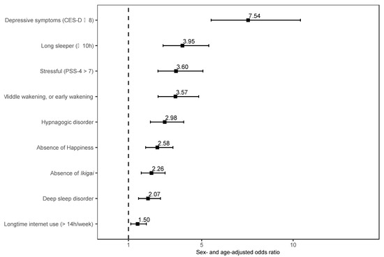 - Ikigai.The Japanese term “Ikigai” is a positive reason for living [34]. Participants were asked, “Do you have any positive reasons to live?” and answered the question from four options: “very much so,” “yes,” “no,” or “not at all.” Participants who answered “no” or “not at all” were defined as the absence of ikigai.