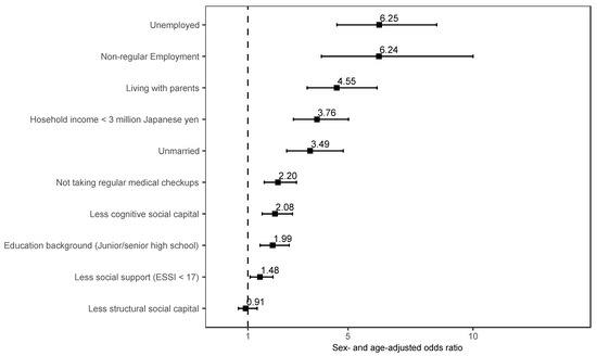 - Social capital.Social capital was assessed using the Integrated Questionnaire for the Measurement of Social Capital (SC-IQ) [37], which is a comprehensive and multidimensional self-report questionnaire designed to measure different aspects of social capital, typically described as assets such as social networks, social participation, trust, and reciprocity. In the present study, we focused on cognitive and structural social capital using specific items from the SC-IQ [38]. For cognitive social capital, we used the following three items: (1) “Can most people be trusted?”; (2) “Does one have to be alert or is someone likely to take advantage of you?”; (3) “Are most people willing to help if you need it?” Responses were selected from four categories: “strongly disagree,” “disagree,” “agree,” and “strongly agree.” For the three questions, cognitive social capital was defined as high when there were two or more responses of “agree” or “strongly agree” to question (1), “disagree” or “strongly disagree” to question (2), and “agree” or “strongly agree” to question (3). For structural social capital, we used the following item from the SC-IQ: “How often do you participate in community organizations, self-help groups, charities, volunteer groups, or religious gatherings?” The response was selected from four categories: “not at all/very seldom,” “sometimes,” “less than once a week,” and “more than once a week.” Structural social capital was defined as high when the response was “more than once a week.”