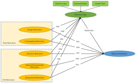 Recently, health and wellness tourism has been developing, especially in China, possibly due to the relaxation of COVID-19 prevention and control restrictions [,,]. However, few studies have focused on tourists’ psychological variables, including motivation, perceived value, and behavioral intention in health and wellness tourism. Based on the theory of push and pull motivation, factor analysis and structural equation models were utilized to explore the relations between tourism motivation and behavioral intention in health and wellness tourism, and the mediating role of perceived value in the aforementioned relation. The results showed that (i) tourists’ motivation significantly positively predicted their behavioral intention in health and wellness tourism and (ii) perceived value significantly played a partial mediating role in the association between tourists’ motivation and behavioral intention in health and wellness tourism. In particular, the four sub-dimensions of tourists’ motivation, including escape motivation, attractive motivation, natural environmental motivation, and interpersonal motivation significantly positively impacted their perceived value, which in tune significantly positively impacted their behavioral intention, while no empirical evidence supported the mediation effect of perceived value on the correlation between behavioral intention and consumption motivation.