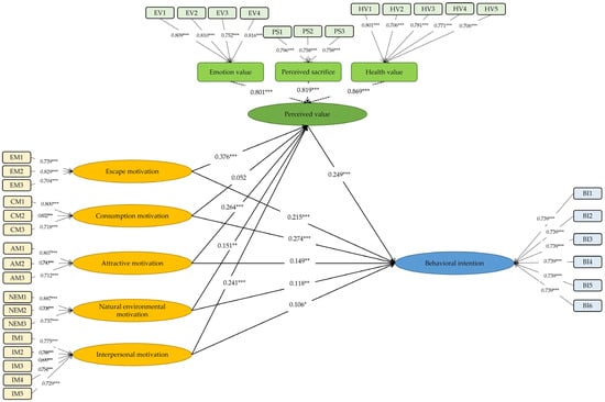 Table 5 depicted the influencing paths of the variables. Tourists’ behavioral intentions were significantly positively predicted by tourism motivation, including escape motivation, consumption motivation, attractive motivation, natural environmental motivation, and interpersonal motivation (β = 0.215, p < 0.001; β = 0.274, p < 0.001; β = 0.149, p = 0.002; β = 0.118, p = 0.004; β = 0.106, p = 0.030, respectively). Tourists’ perceived value was significantly positively predicted by escape motivation, attractive motivation, natural environmental motivation, and interpersonal motivation (β = 0.376, p < 0.001; β = 0.264, p < 0.001; β = 0.151, p = 0.001; β = 0.241, p < 0.001, respectively). Travelers’ consumption motivation did not have a significant impact on their perceived value in health and wellness tourism (β = 0.052, p = 0.273). Travelers’ perceived value significantly positively predicted their behavioral intention in health and wellness tourism (β = 0.249, p = 0.002).