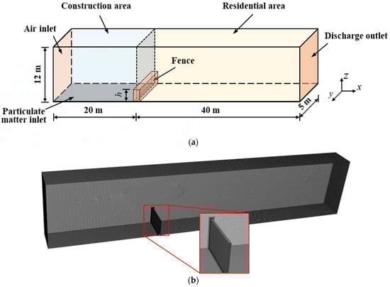 Since a municipal road construction site is an open flow field, the higher the temporal resolution and the smaller the spatial resolution of the numerical model, the more accurate the reflection of the actual state of the flow field. However, a wider range of computing domains leads to a dramatic increase in the number of elements and the time cost of numerical calculations. To achieve a balance between computing efficiency and numerical accuracy, this study simplifies the numerical model and ignores the influence of surrounding buildings on the flow field. The flow field calculation region model is built using the SolidWorks three-dimensional modeling software, and its numerical calculation length and cross-section size are 60 m and 5 m × 12 m, respectively. The enclosure is located at the junction of the construction and residential areas and 20 m from the air inlet. The enclosure height h is set to 0, 2, 2.5, 3 and 3.5 m. The particles are generated over the entire range of the ground area of the construction site and spread to the residential area under airflow action. The numerical model of NPSD is shown in Figure 1a. A structured meshing scheme with hexahedral elements is adopted in this model, and the mesh is refined at the enclosure. The meshing scheme on the model is illustrated in Figure 1b.