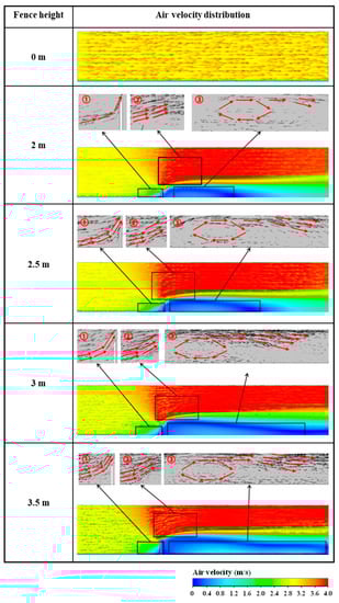 The condition of airflow is an important factor affecting the release, diffusion, and settlement of dust particles. The relationship between enclosure height and PM distribution in residential areas can be analyzed by studying the influence of enclosures on airflow. In this study, a symmetric cross-section S (Figure 2) is selected as the monitoring surface of the model airflow field, and the velocity distribution on this airflow field under different enclosure heights is analyzed.
