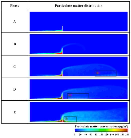 Stage A represents the initial diffusion of particles. At this stage, the particles of NPSD are driven by airflow spread from the air inlet to the residential area. When the particles spread to the ascending airflow section under the combined action of the updraft and enclosure, some of the particles are deposited in the local calm area on the windward side of the enclosure, whereas other particles spread upward. The mass concentration and diffusion height of PM are high and low near and away from the construction area enclosure, respectively; moreover, no particles are detected in the residential area. In stage B, the concentration of particles on the windward side of the enclosure increases. A portion of the particles spread upward with the updraft and then spread to the airflow confluence area above the enclosure. The diffusion height increases owing to the influence of deflecting airflow. In stage C, the particles that accumulate on the windward side of the enclosure increase continuously. Concurrently, the particles across the enclosure through the airflow convergence area increase and continue to spread to residential areas. At this moment, some of the particles spread to region ➃, which leads to particle reflux under the action of the swirling airflow in the large-area vortex region. In stage D, the NPSD particles in region ➃ gradually move to the leeward side of the enclosure and accumulate under the drive of the vortex. Concurrently, the PM concentration gradually increases in the residential areas. In stage E, numerous particles accumulate on the windward and leeward sides of the enclosure. At the same time, particles are detected over a wide part of the residential areas, and the particle concentration decreases with the increase in diffusion distance.