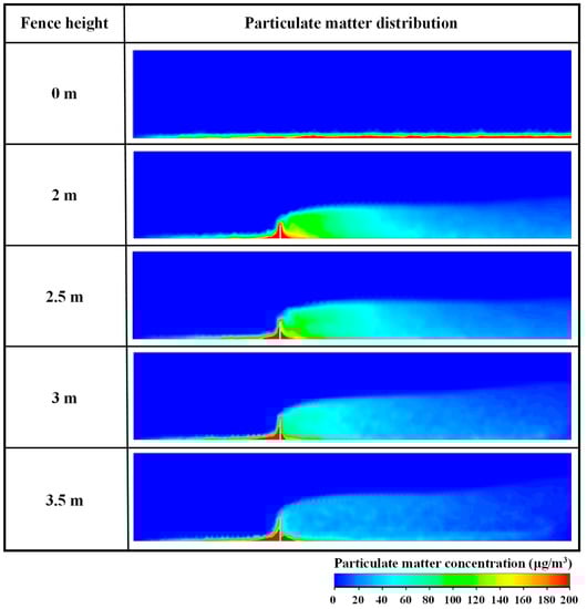 As shown in Figure 5, when no enclosure is set, the diffusion of the particles is uniform and smooth because the air is not distinctly disturbed in the flow process. Moreover, numerous particles migrate from the construction area to the residential area. After setting the enclosure, the concentration of particles on the windward side increases, indicating the accumulation of particles in this area. With an increase in the enclosure height, the accumulation of particles in this area gradually increases, which confirms that the number of particles blocked in the construction area also increases with the enclosure height. On the other side of the enclosure in the residential area, some of the NPSD particles reflux and accumulate on the leeward side of the enclosure under the action of eddy airflow in the vortex area. In contrast to the windward side, the concentration range of the particles in the vortex area has a negative relationship with the enclosure height. In detail, after setting the enclosure, the diffusion range of NPSD particles in the residential area increases; however, their overall concentration is lower than that without the enclosure. Moreover, with increasing enclosure height, the PM concentration gradually decreases. Specifically, when the enclosure height is 3 m, the PM only concentrate near the enclosure in the residential area; when the enclosure height is 3.5 m, the PM concentration over a wide section of the residential area is less than 40 μg/m3.