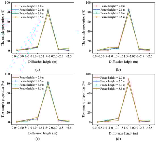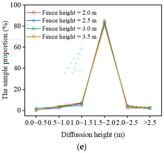 In this study, to investigate the diffusion law of NPSD particles in the construction area considering different wind speeds and enclosure heights, five initial horizontal wind speeds (1, 2, 3, 4, and 5 m/s) are selected considering that outdoor engineering activities are halted under strong winds and severe weather conditions. The calculation time of the numerical simulation is set to 240 s, and particle monitoring zone L shown in Figure 6 is selected. The diffusion height of NPSD particles in the monitoring zone under different enclosure heights and wind speeds is calculated for 240 s. Figure 7 describes the diffusion height distribution of NPSD particles above the enclosure under different enclosure heights and wind speeds. According to Figure 7, it can be indicated that under various working conditions, the diffusion height sample points of NPSD particles above the enclosure are fundamentally concentrated in the diffusion range 1.5–2.0 m. When the enclosure height is 2 m and the wind speed is 4 m/s, the percentage of sample points in the 1.5–2.0 m range reaches 90.42%, which is the highest proportion achieved. When the enclosure height is 3.5 m and wind speed is 1 m/s, the proportion of sample points in this range is relatively low. As shown in Figure 7a, when the initial horizontal wind speed is 1 m/s, the diffusion height of the particles increases with the enclosure height. When the enclosure height is 3.5 m, the number of samples whose particle diffusion height range is more than 2.5 m is 13, accounting for 8.75% of the samples. When the wind speed increases, the effect of the enclosure height on the particle diffusion height gradually decreases. The foregoing analysis indicates that when the wind speed is 1–5 m/s and the enclosure height is 2–3.5 m, the diffusion height of NPSD particles above the enclosure is less than 2 m. Therefore, an optimal injection height of the atomizing nozzle above the enclosure is 2 m.