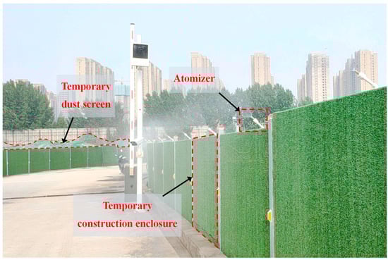 (2) External interception of NPSD: The erection of construction site enclosures and water sprinkling of these enclosures can intercept dust particles during diffusion, as shown in Figure 8. It was observed in Section 4.3 that when the enclosure height is 3~3.5 m, the dust concentration in most parts of the residential area can be reduced to 40 μg/m3. The concentration of particulate matter meets the emission standard. Therefore, the enclosure height of construction sites near main road sections and residential areas in the city must exceed 3 m, while the enclosure height of construction sites on secondary areas can be appropriately reduced. Moreover, an automatic atomization nozzle is set above the enclosure with the injection height set above 2 m to intercept particles escaping from the construction. Furthermore, an automatic information collection module can also be used to monitor the wind speed and concentration of dust particles in the construction area and regulate the operation of the atomization nozzle automatically. In addition, the area surrounding the construction enclosure must be regularly cleaned to prevent the accumulated particles on both sides of the enclosure that could subsequently rise and spread.