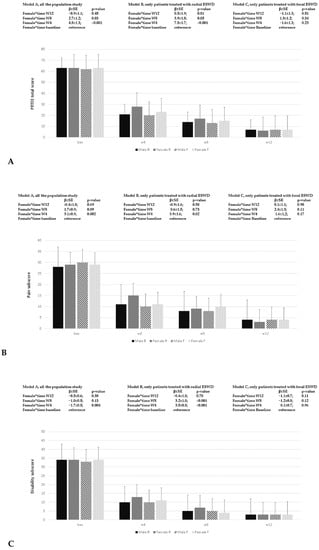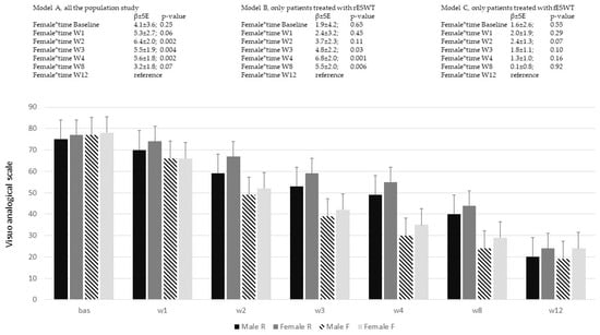Figure 1, the VAS score according to time, treatment and sex is reported; moreover, the estimates from LMM of the interaction “sex for time”, within the entire sample of patients included in the study, except those that dropped out, were also reported in the following groups: independently of treatment (Model A), patients that underwent ES-R (Model B), and lastly, patients that underwent ES-F (Model C). Female patients reported a higher VAS score in the entire population (Model A), at W4 (