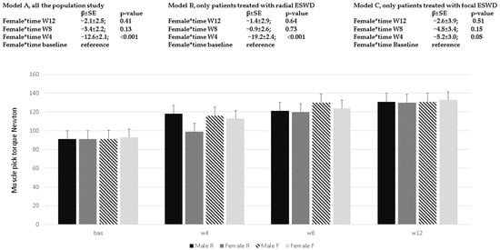 Figure 2, variation in muscle pick torque according to time, treatment, and sex is reported. Additionally, in this case, muscle pick strength increased less in the female sex compared to male, but only at W4 in the Model A that considers the whole population of the study and in Model B that considers those patients that underwent rESWT; this is not the case for those patients treated with fESWT in Model C.